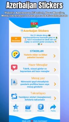Simplifică-ți procesul de trimitere a felicitărilor și a mesajelor cu ajutorul secțiunii noastre de mesaje predefinite. Ai la dispoziție sute de texte gata pregătite pentru zile de naștere, Novruz, Anul Nou, mesaje de dragoste, religioase și multe alte evenimente, pe care le poți copia și trimite instantaneu. Aplicația este actualizată constant, înaintea evenimentelor și sărbătorilor importante, asigurându-te că ai întotdeauna la dispoziție cele mai noi și relevante stickere și mesaje. Pentru o experiență complet neîntreruptă de reclame și pentru a susține dezvoltarea continuă a platformei, ai opțiunea de a activa versiunea Pro printr-o taxă simbolică. Descoperă toate aceste avantaje și rămâi conectat la noutăți urmărindu-ne pe rețelele sociale, detaliile fiind disponibile în secțiunea "Haqqında" a aplicației. Apreciem feedback-ul tău și suntem mereu dornici să aflăm cum putem îmbunătăți experiența ta; te încurajăm să ne scrii la