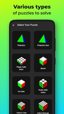 Gama de puzzle-uri abordate de Cube Cipher - Cube Solver and Cube Timer este impresionantă. Pe lângă faimoasele Pocket Cube 2x2x2, Cube 3x3x3 și Revenge 4x4x4, vei găsi soluții facile pentru Pyraminx, Skewb, Ivy Cube, Dino Cube (inclusiv varianta cu 4 culori), Six Spot Cube, Pyraminx Duo, Coin Tetrahedron, DuoMo Pyraminx, Floppy Cube (3x3x1), Domino Cube (3x3x2), Tower Cube (2x2x3) și Cuboid (2x2x4). Fiecare soluție este optimizată pentru a minimiza numărul de mutări, asigurându-te că obții cea mai eficientă cale. Aplicația oferă, de asemenea, o varietate de algoritmi avansați și modele de cuburi pentru a-ți extinde repertoriul și a-ți îmbunătăți înțelegerea.