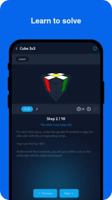 Perfecționarea vine cu practica, iar această aplicație vă oferă instrumentele necesare. Exersați rezolvările contra cronometru cu funcția SpeedCubing, care generează amestecări aleatorii și înregistrează statistici detaliate pentru a vă monitoriza progresul și a vă îmbunătăți timpii. Pentru începători sau pentru cei care doresc să-și consolideze cunoștințele, secțiunea de lecții pas cu pas este un ghid valoros, oferind instrucțiuni clare. Mai mult, vă puteți exprima creativitatea și explora noi abordări prin crearea și salvarea propriilor modele de cuburi.