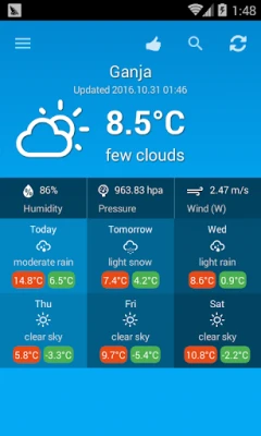 Obțineți prognoza meteo detaliată pentru Azerbaidjan. Aplicația oferă informații esențiale, inclusiv temperaturi maxime și minime, viteza vântului, viteza norilor și nivelul umidității. Rămâneți informat cu precizie despre condițiile atmosferice curente și viitoare din regiune.